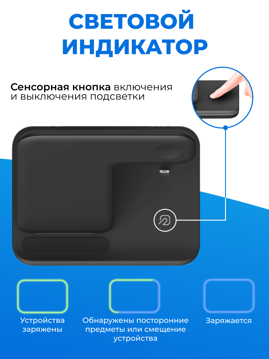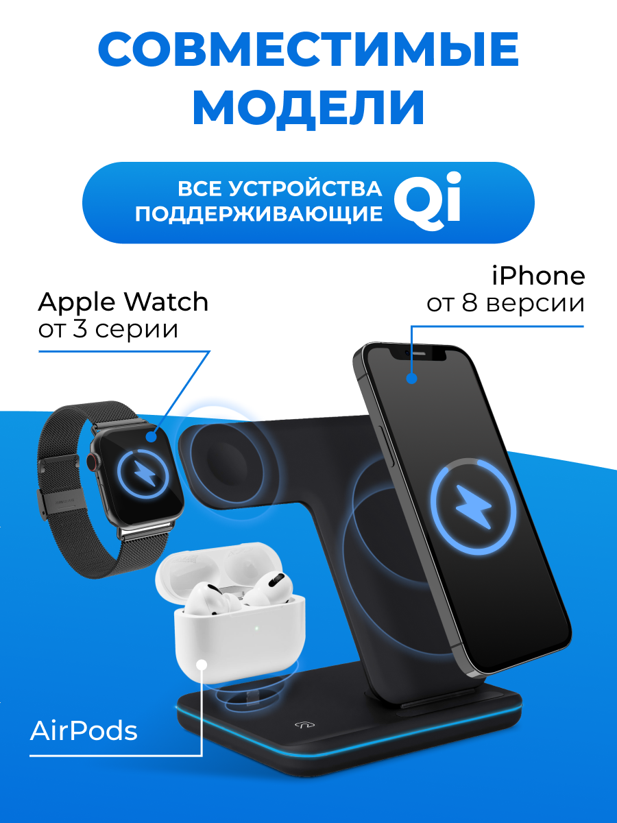 Заряжает 3 устройства сразу: смартфон (Qi-стандарт), Apple Watch (магнитный модуль), AirPods (беспроводная зарядка или разъем Lightning).