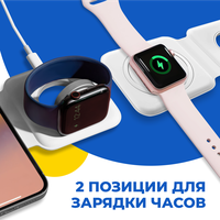 Док-станция 2 в 1 (15 Ватт) представляет собой стильную и компактную док-станцию сразу для двух гаджетов. Беспроводная зарядка совместима со всеми гаджетами, поддерживающими стандарт беспроводной зарядки. Беспроводное зарядная станция позволяет быстро и эффективно зарядить 2 различных устройства. Кроме того, эта док-станция оснащена специальным держателем для Apple Watch, который позволяет удобно и безопасно заряжать часы. Также на станции имеется отдельное место для зарядки наушников AirPods, что позволяет вам всегда иметь их под рукой и готовыми к использованию. Док станция совместима с всеми устройства Apple iPhone, Apple AirPods, Apple Watch, поддерживающими беспроводную зарядку. Зарядная станция также подходит для всех телефонов Android: Xiaomi, Samsung Galaxy, Huawei, Honor, Vivo, Realme, Tecno, Motorola, которые поддерживают беспроводную зарядку.