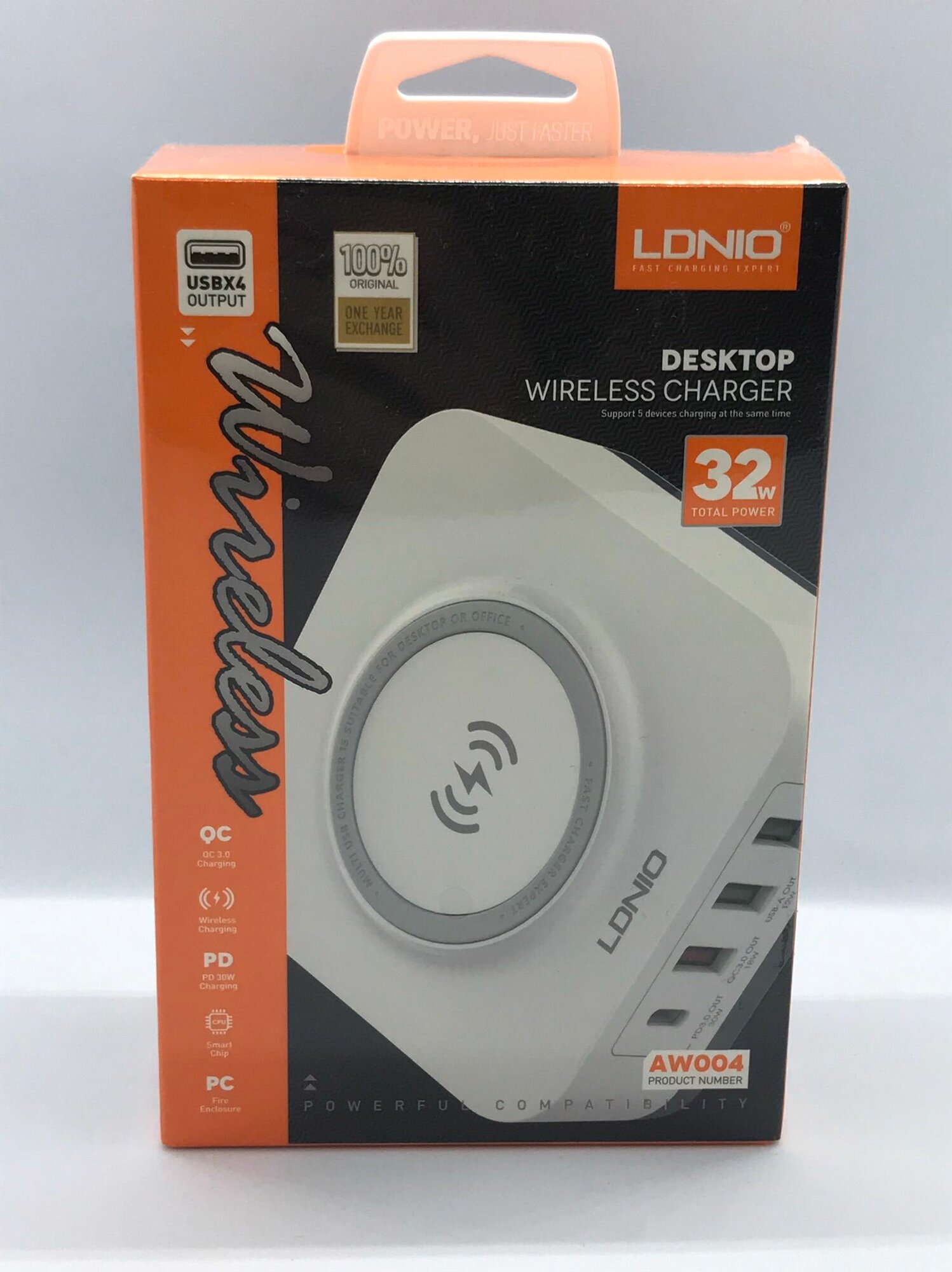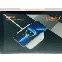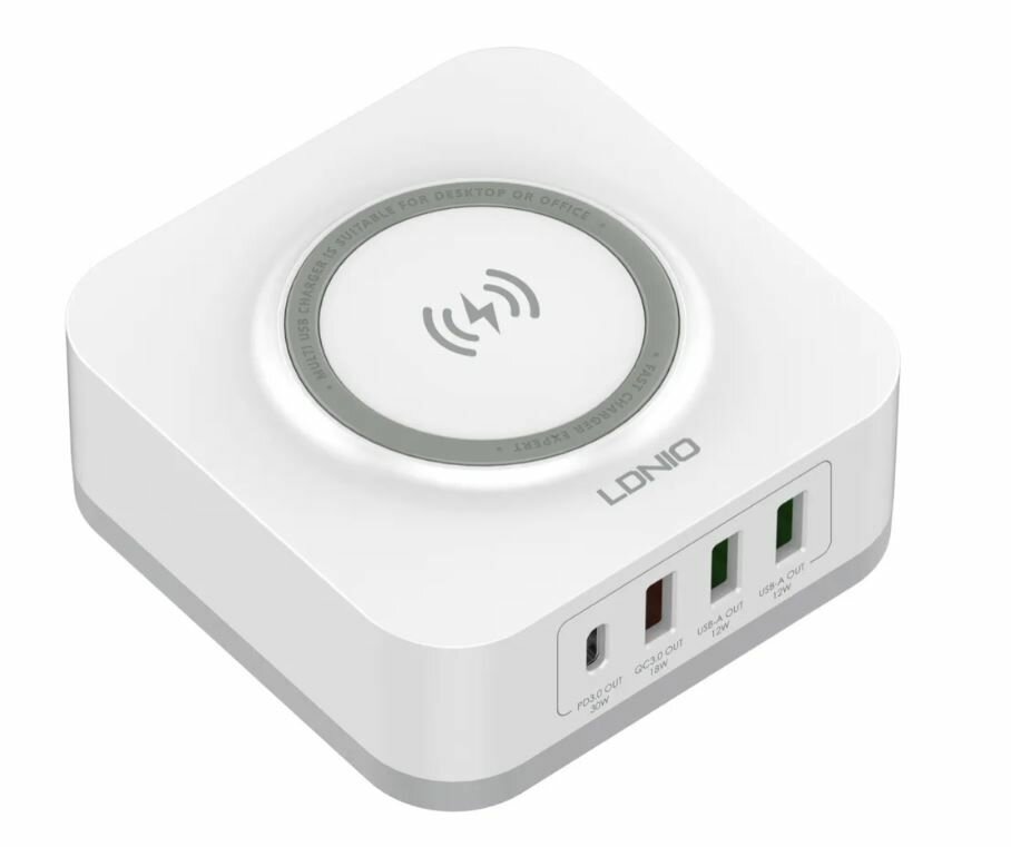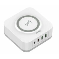Сетевое зарядное устройство LDNIO AW004 - это стильная и качественная настольная зарядная станция для мобильных устройств. Особенностью данной модели является наличие беспроводной зарядки стандарта Qi мощностью до 15 Вт. Устройство имеет четыре USB выхода: один TYPE-C с поддержкой протокола быстрой зарядки PD и три TYPE-A: 2 USB порта (зеленого цвета) поддерживают обычную зарядку с технологией Auto ID, 1 порт (красного цвета) поддерживает функцию быстрой зарядки Quick Charge 3.0. Входное напряжение - от 100 до 240 В. Выходные параметры: PD:5V-3A,9V-3A,12V-2.5A (Max -30W), QC 3.0: 5V-3A,9V-2A,12V-1.5A (Max-18W). Максимальная мощность – 32 Вт. LDNIO AW004 имеет многоуровневую систему защиты: от повышенного тока, от повышенного напряжения, от короткого замыкания, от перегрева. Корпус устройства изготовлен из высококачественного негорючего пластика (до 850 гр. C).
