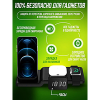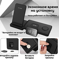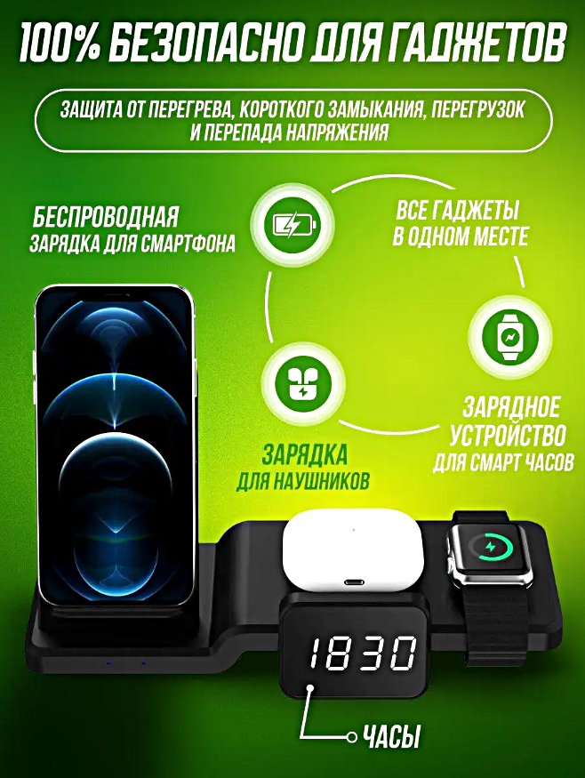 Зарядная станция 4 в 1 15W для устройств Apple будет заряжать ваши устройства, пока вы спите или работаете, и не займет много места на столе или прикроватной тумбочке. Быстрая и мощная: Мощности зарядки в 15 Вт достаточно, чтобы обеспечить быструю подзарядку аккумулятора. Зарядная станция автоматически распознает подключенное устройство, что позволяет производить процесс подзарядки на безопасно максимальной скорости. Одновременная зарядка: Устройство позволяет одновременно заряжать смартфон, планшет, Apple Watch и наушники. Таким образом, зарядная станция даёт возможность заряжать четыре устройства сразу. Это беспроводное зарядное устройство совместимо с Apple Watch 1 – 6, SE Series, Airpods 2 и Pro, iPad, iPhone и другими устройствами, поддерживающими беспроводную зарядку стандарта QI. Дизайн и материалы: Беспроводное зарядное устройство изготовлено из противоударного пластика и дополнено мягкими вставками, которые не поцарапают экран и корпус ваших гаджетов. Дополнение в виде настольных часов – необычный и практичный выбор. Часы также работают от батарейки (не включена в комплект). Защита: Беспроводная зарядка имеет встроенную защиту от короткого замыкания, перезаряда, перегрева, скачков напряжения. Обратите внимание: Для работы зарядного устройства в режиме быстрой зарядки необходимо использовать сетевой адаптер с поддержкой QC3.0. Не идет в комплекте, приобретается отдельно.