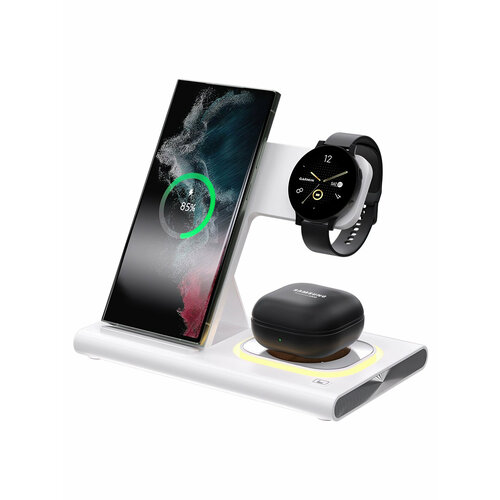 Устройство также оснащено сертификатом MFi, что подтверждает его качество и совместимость с устройствами Samsung. В комплект поставки входит база для беспроводной зарядки, сетевой блок питания с разъемом USB Type-C и блок питания базы со встроенным кабелем USB Type-C.