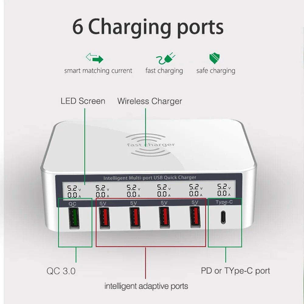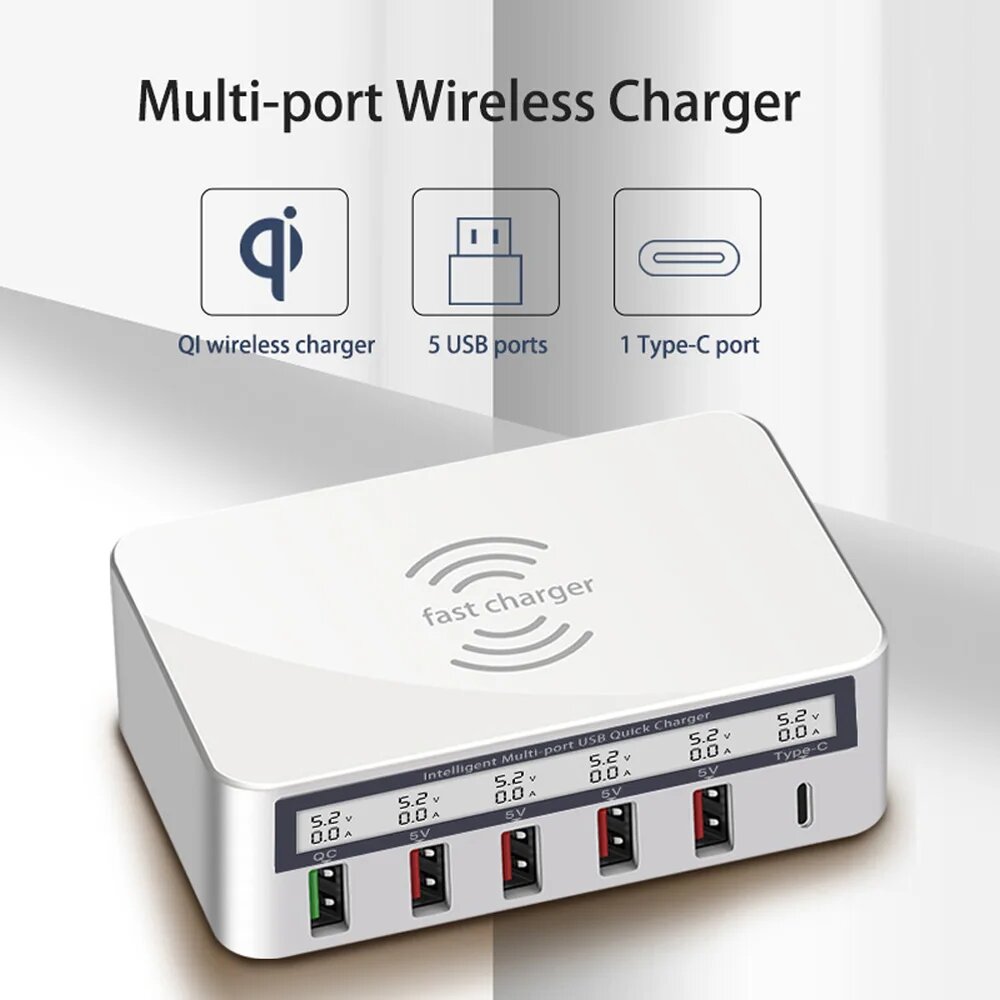 Беспроводное зарядное устройство с несколькими USB-портами, быстрая зарядка 3,0, зарядное устройство USB Type-C, адаптер со светодиодным дисплеем для iPad Air Mini iPhone 12 13 11 Pro XS Max Samsung S9, быстрая зарядка, EU plug, With Wireless Charge: сравнение цен, характеристики, фото, актуальное наличие и цены.