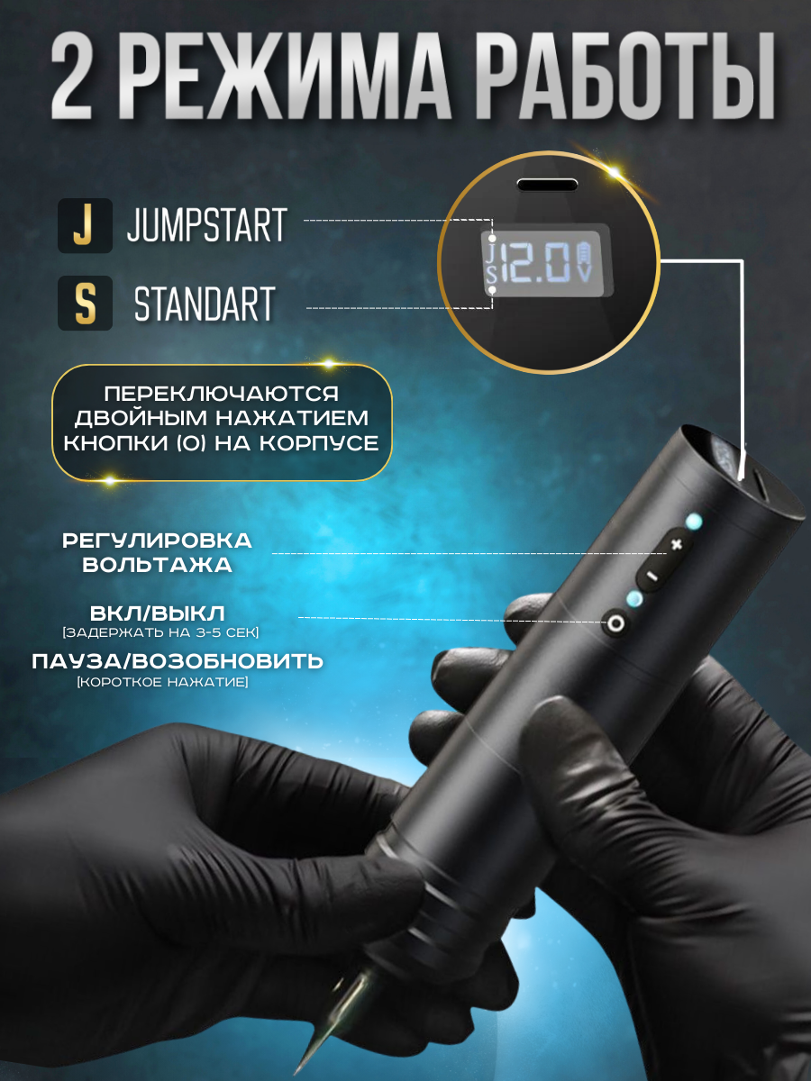 Кнопочное управление включением и выключением тату машинки Ниндзя, регулировка напряжения и установка любимых настроек для быстрого переключения.