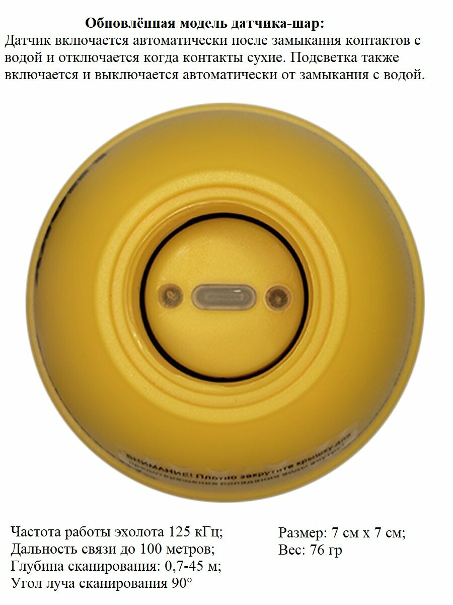 Совместим со всеми беспроводными эхолотами Лаки; Датчик включается автоматически после замыкания контактов с водой; Целиком водонепроницаемый; Частота работы эхолота 125 кГц; Дальность связи до 100 метров; Глубина сканирования: 0,7-45 м; Угол луча сканирования 90°