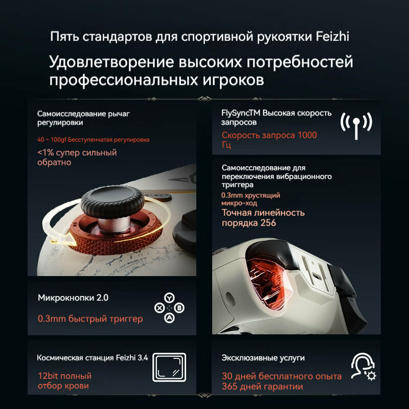 | Подробная комплектация | Контроллер Flydigi Vader 4 Pro — 1 шт; 2.4G USB-адаптер — 1 шт; USB-Type-C зарядный кабель — 1 шт; Инструкция по эксплуатации — 1 шт. |