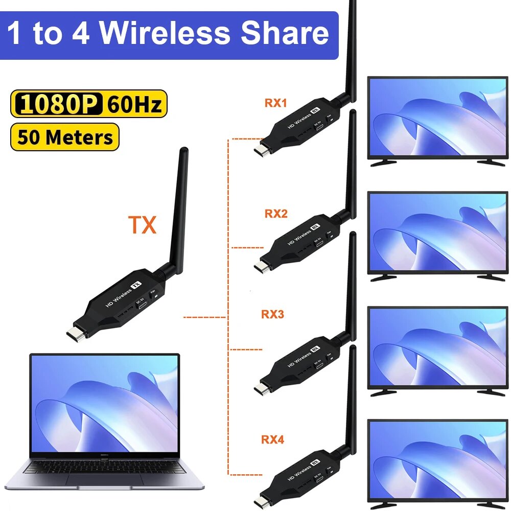 Беспроводной HDMI удлинитель 50м 1×4, 1 TX and 2 RX: сравнение цен, характеристики, фото, актуальное наличие и цены.