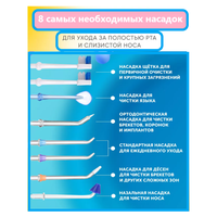 | Насадки | для струйной чистки, для чистки имплантов и коронок, для чистки языка, назальная, насадка-щетка, ортодонтическая (для брекетов), пародонтологическая (для десен) |