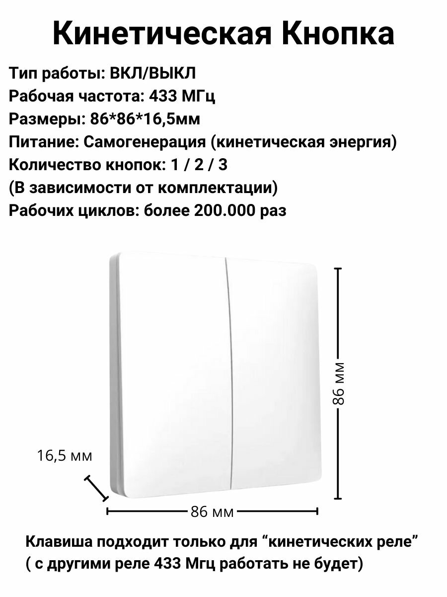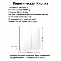 Использует уникальную технологию сбора энергии. Когда Вы нажимаете кнопку, модуль преобразования энергии внутри преобразует кинетическую энергию в электрическую. Затем беспроводной модуль кнопки отправляет сигнал на приемник. Приемник получает сигналы и включает / выключает свет.