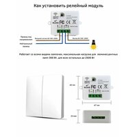 Зажмите кнопку на реле на 3 секунды, после этого нажмите на клавишу на выключателе, светодиод мигнёт это будет означать, что после нажатия выбранной кнопки один раз реле включится и выключится только после однократного нажатия той-же кнопки.