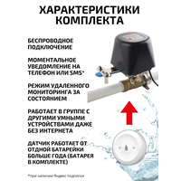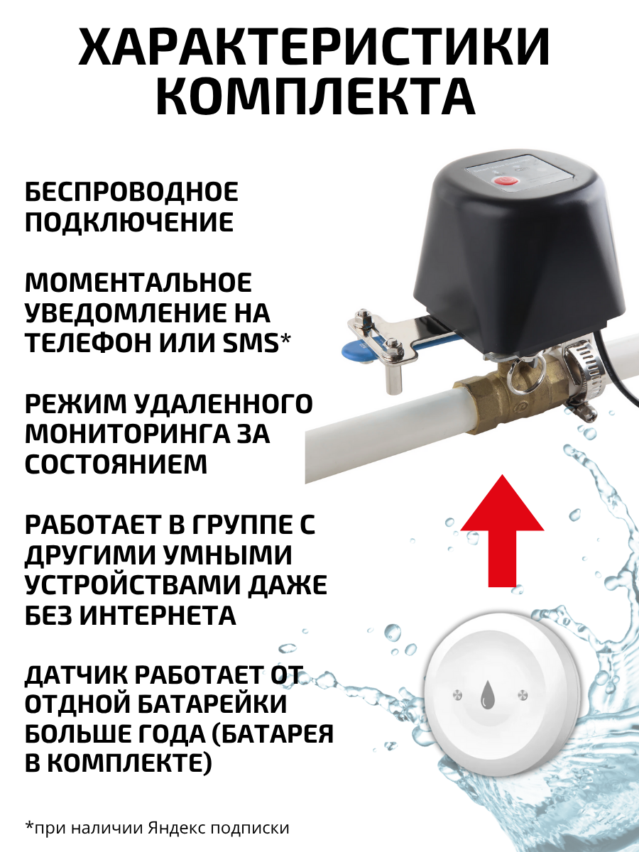 | Подробная комплектация | Умный привод перекрытия воды - 1 шт., умный датчик протечки - 2 шт., инструкция - 1 шт. |
