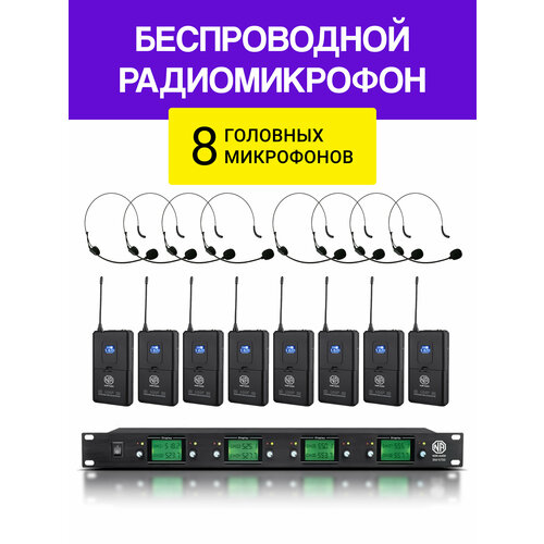 Беспроводной микрофон, который состоит из 8 (восьми) высококачественных вокально-речевых беспроводных головных микрофонов, 8 (восьми) поясных передатчиков и 1-го приемника. Подходит для вокала и проведения мероприятий.