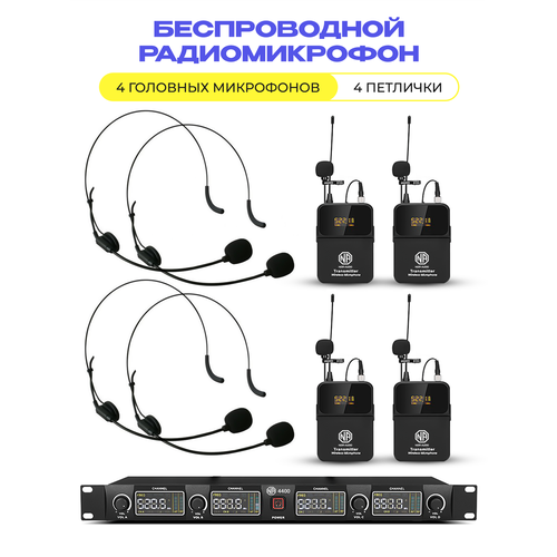 Беспроводной микрофон, который состоит из 1-го приемника, 4-х поясных передатчиков, 4-х головных вокально-речевых микрофонов черного цвета и 4-х петличных микрофонов.