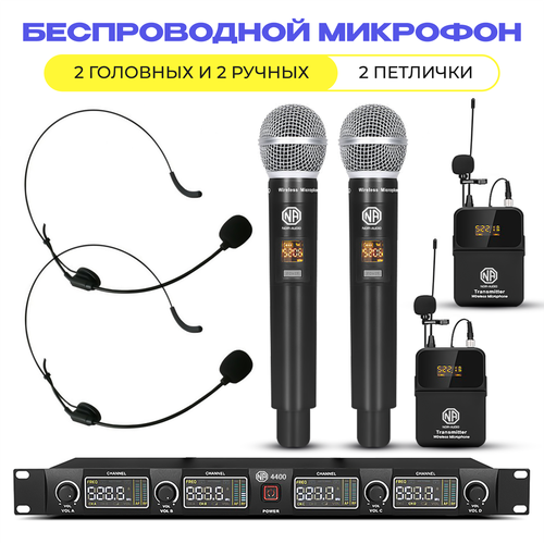 Беспроводной микрофон, который состоит из 1-го приемника, 2-х ручных микрофонов в металлическом корпусе, 2-х поясных передатчиков, 2-х головных вокально-речевых микрофонов черного цвета и 2-х петличных микрофонов.