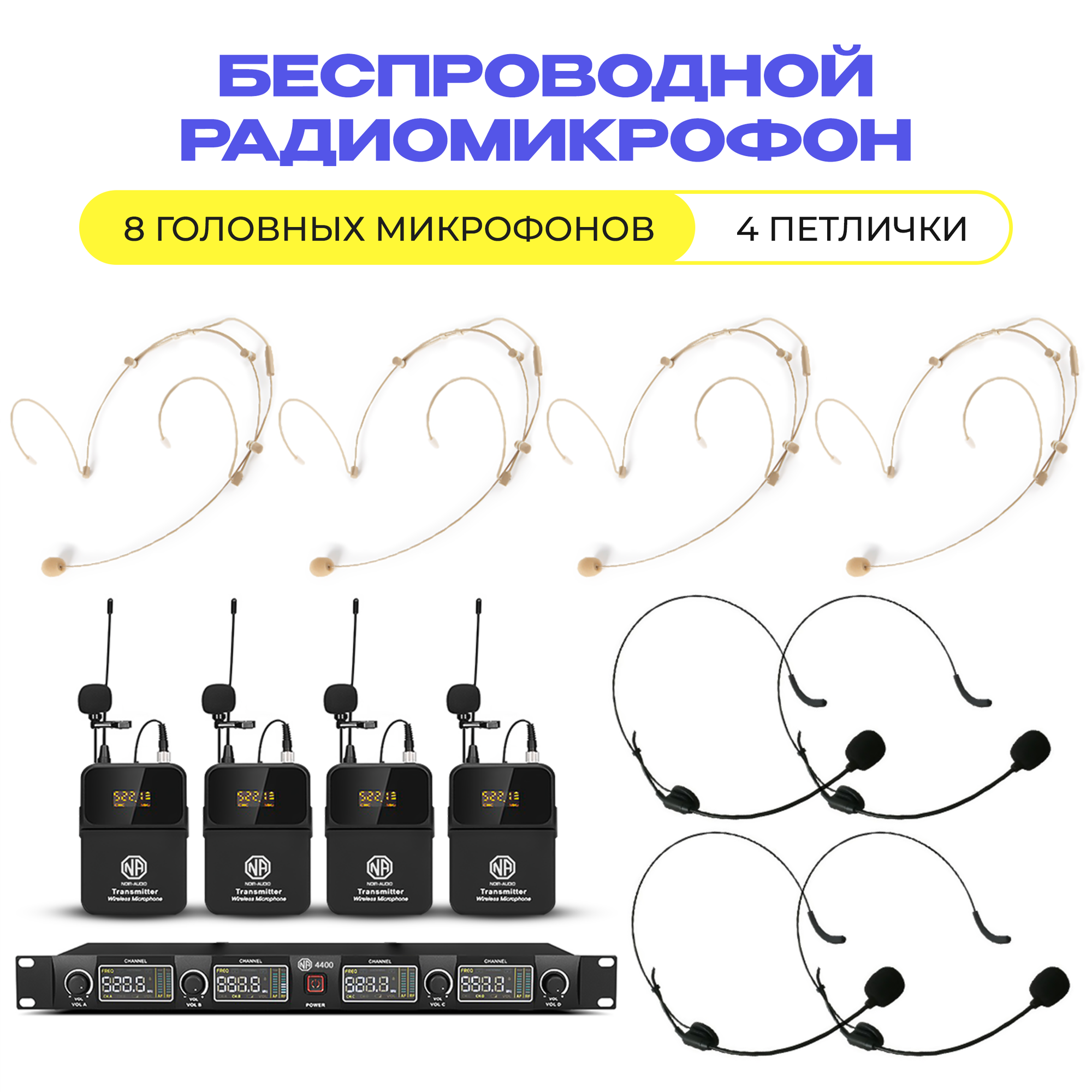 Беспроводной микрофон, который состоит из 1-го приемника, 4-х поясных передатчиков, 8-ми головных вокально-речевых микрофонов и 4-х петличных микрофонов.