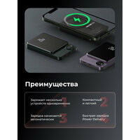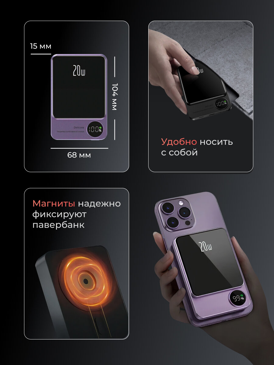 Благодаря технологии MagSafe, этот повербанк совместим с iPhone, а также с Android (Xiaomi, Samsung) смартфонами, оснащенными MagSafe-совместимыми чехлами.