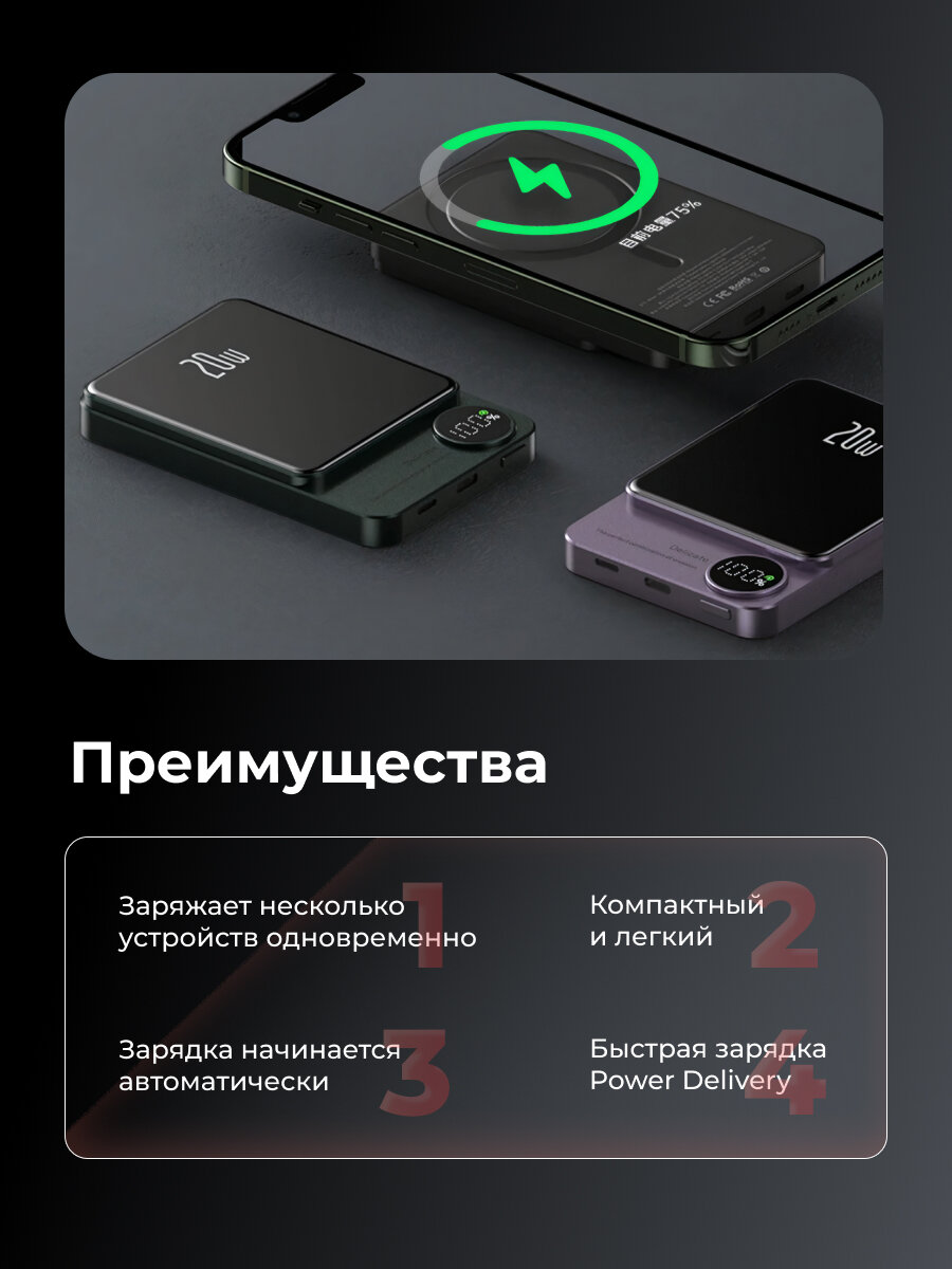 Беспроводная зарядка-повербанк MagSafe для iPhone 10000 mAh 20 Ватт - это портативное зарядное устройство, которое обеспечивает быструю зарядку и надежную защиту ваших устройств.
