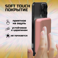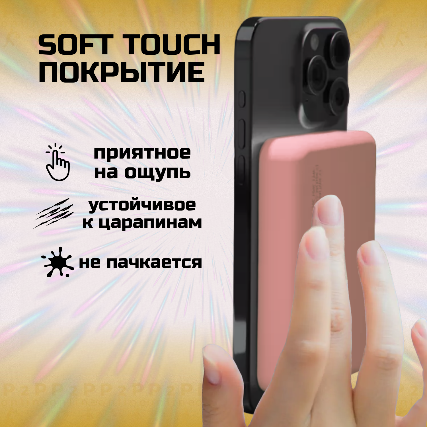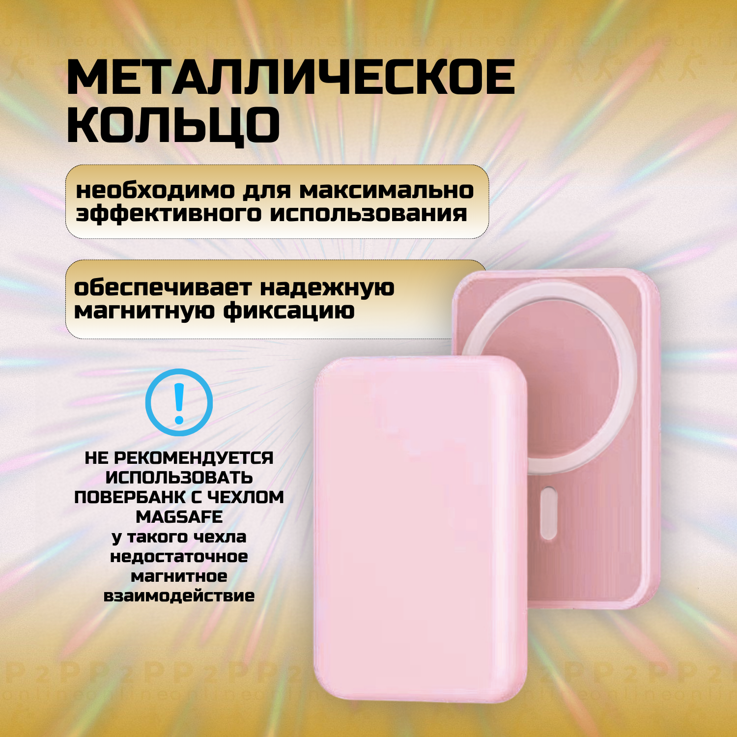 Емкость аккумулятора составляет позволяет заряжать ваши устройства несколько раз. Совместимость с MagSafe и другими беспроводными зарядками (см. документацию вашего устройства). Беспроводной PowerBank MagSafe совместим с MagSafe, что обеспечивает быструю и удобную зарядку ваших устройств. Кроме того, он также поддерживает беспроводную зарядку и зарядку для Apple Watch, что делает его многофункциональным аксессуаром для вашего смартфона, часов и других устройств. Благодаря наличию разъема Lightning, вы можете одновременно заряжать два устройства, что особенно удобно в дороге или на отдыхе. Кабелем Lightning товар не комплектуется! Быстрая зарядка и защита от перегрева и короткого замыкания. С максимальным током 2,1А и временем зарядки около часа, беспроводной PowerBank MagSafe обеспечивает быструю зарядку ваших устройств. Защита от перегрева и короткого замыкания гарантирует безопасность использования и продлевает срок службы аккумулятора. Компактный и легкий корпус из ABS пластика с тактильно приятным покрытием Soft Touch - вам понравится! Беспроводной PowerBank MagSafe имеет небольшие размеры и вес, что делает его портативным и легким для переноски. Корпус изготовлен из прочного ABS пластика, который обеспечивает долговечность и защиту от повреждений. Комплектация и упаковка: В комплект поставки входит PowerBank выбранного объема и цвета, кольцо Маг Сэйф, а также коробка для удобной транспортировки и хранения.