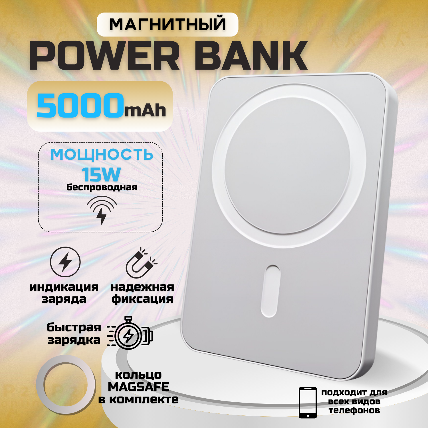 Купить Беспроводной повербанк Внешний PowerBank аккумулятор MagSafe 5000 мАч Быстрая зарядка Магнитный аккумулятор с доставкой по всей России. Беспроводной повербанк Внешний PowerBank аккумулятор MagSafe 5000 мАч Быстрая зарядка Магнитный аккумулятор: сравнение цен, характеристики, фото, актуальное наличие и цены.