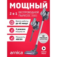 Ручной пылесос ARNICA Solara ET13450 белого цвета обладает габаритами 74х14х20 см и массой 1,6 кг.