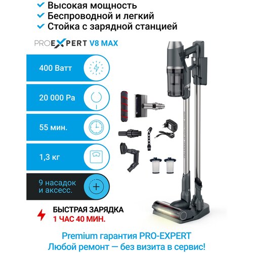 Беспроводной пылесос PRO-EXPERT V8 MAX - это максимальная комплектация модульного беспроводного пылесоса PRO-EXPERT V8.