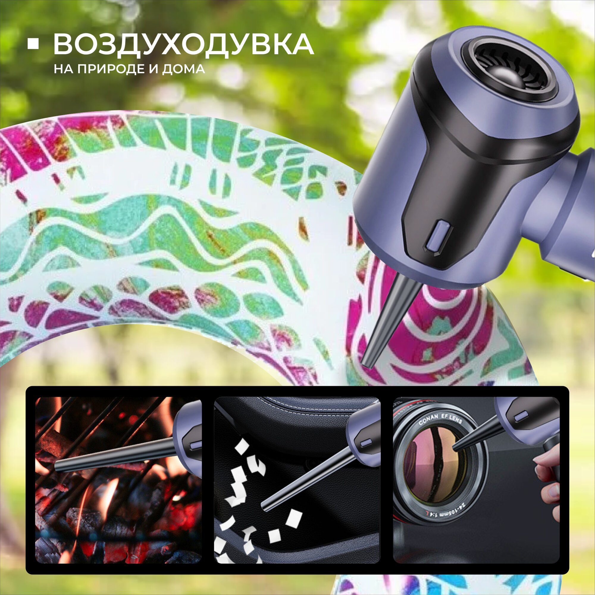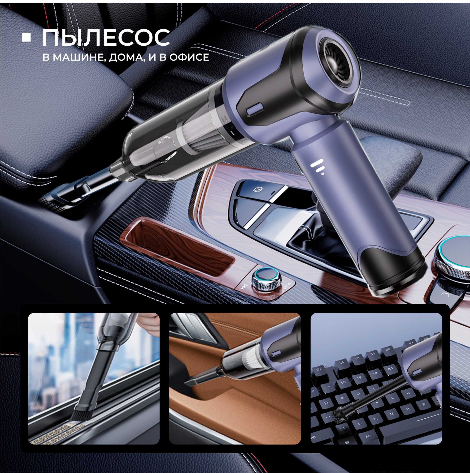 Наш пылесос это портативный мини гаджет без проводов и с размерами в кейсе 20×30 см, поэтому Вы можете взять его с собой куда угодно. Автопылесос можно использовать не только для чистки авто, он отлично подойдет для мягкой мебели, кресла или дивана. Поможет быстро пропылесосить различные поверхности в доме, а надев длинную насадку ветродуй, Вы получите воздуходувка для мангала, насос для шариков, насос для надувного матраса ! Так же он идеален в использовании как воздуходувка для ноутбука и компьютера. Беспроводной пылесос мощный для автомобиля компактного размера не занимает много места при хранении и перевозке.