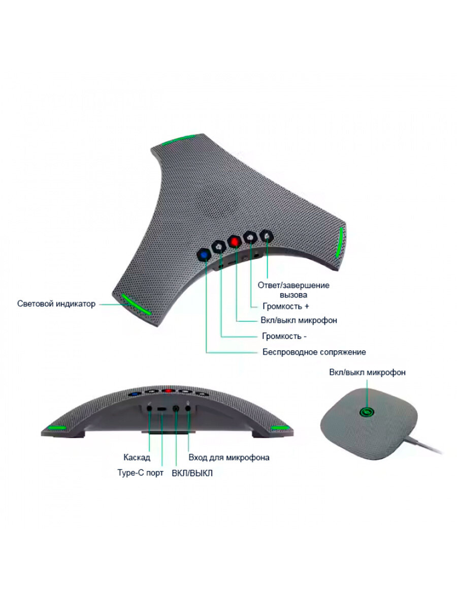 Спикерфон JazzTel Various Plus. Кабель Type-C, длина 1,5 метра. Руководство пользователя. Беспроводной USB-адаптер. Дополнительный микрофон. Аудиокабель 3,5 мм.
