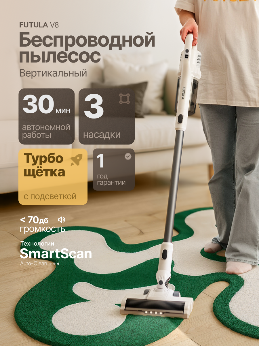 Беспроводной пылесос Futura Cordless Vacuum Cleaner отличается легким весом, эргономичной конструкцией и высокой маневренностью. Он имеет две скорости работы и две насадки: основную роликовую щетку и щетку "2 в 1". Время работы составляет до 30 минут в обычном режиме и до 18 минут в турбо-режиме.