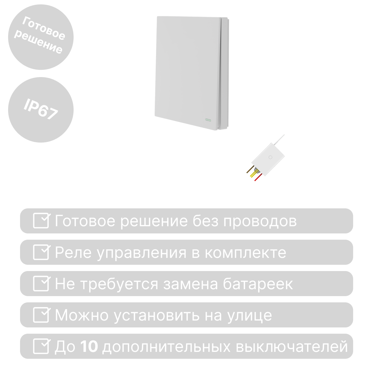 Беспроводной выключатель GRITT Evolution 1кл. белый комплект: 1 выкл. IP67, 1 реле 500Вт - беспроводной кинетический (без батареек) выключатель для удаленного включения электроприборов без прокладки электропроводки к выключателю. Работает с реле GRITT Core Compact (в комплекте) и реле серий: Core, Core 2.0, EnCore (приобретатся отдельно).