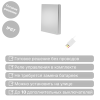 Беспроводной выключатель GRITT Evolution 1кл. серебристый комплект: 1 выкл. IP67, 1 реле 500Вт - беспроводной кинетический (без батареек) выключатель для удаленного включения электроприборов без прокладки электропроводки к выключателю. Работает с реле GRITT Core Compact (в комплекте) и реле серий: Core, Core 2.0, EnCore (приобретатся отдельно).