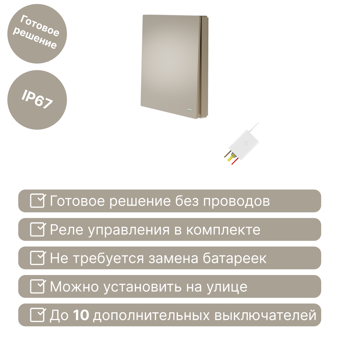 Беспроводной выключатель GRITT Evolution 1кл. золотистый комплект: 1 выкл. IP67, 1 реле 500Вт - беспроводной кинетический (без батареек) выключатель для удаленного включения электроприборов без прокладки электропроводки к выключателю. Работает с реле GRITT Core Compact (в комплекте) и реле серий: Core, Core 2.0, EnCore (приобретатся отдельно).