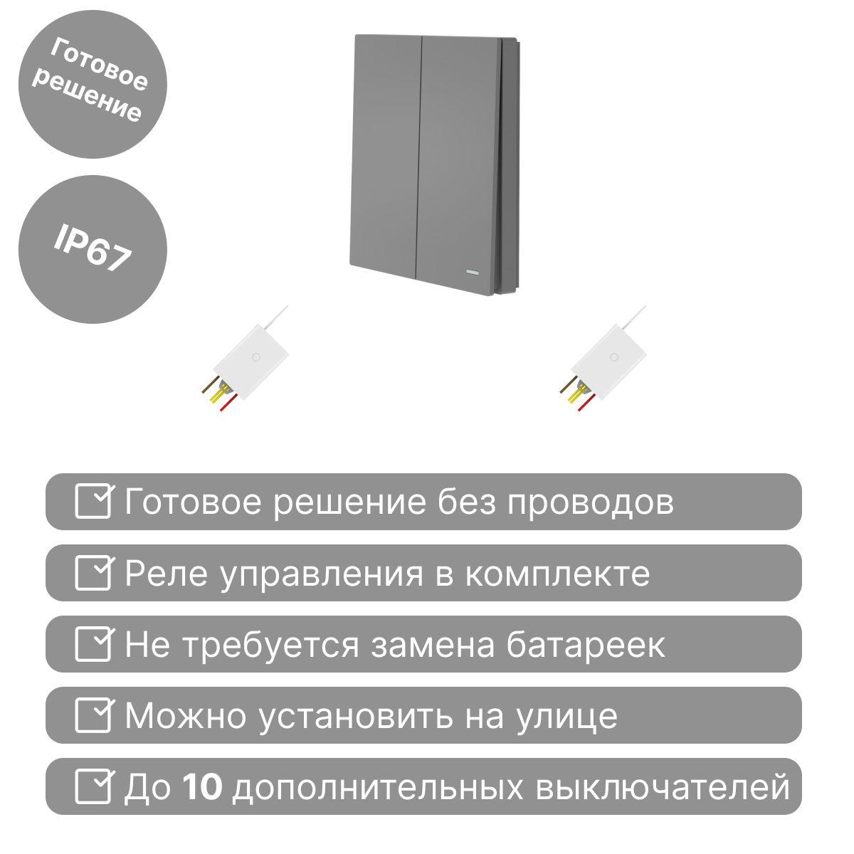 Беспроводной выключатель GRITT Evolution 2кл. графит комплект: 1 выкл. IP67, 2 реле 500Вт - беспроводной кинетический (без батареек) выключатель для удаленного включения электроприборов без прокладки электропроводки к выключателю. Работает с реле GRITT Core Compact (в комплекте) и реле серий: Core, Core 2.0, EnCore (приобретатся отдельно).