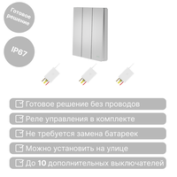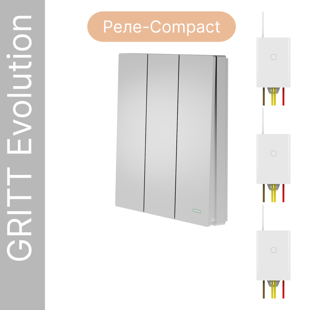 Беспроводной выключатель GRITT Evolution 3кл. серебристый комплект: 1 выкл. IP67, 3 реле 500Вт - беспроводной кинетический (без батареек) выключатель для удаленного включения электроприборов без прокладки электропроводки к выключателю. Работает с реле GRITT Core Compact (в комплекте) и реле серий: Core, Core 2.0, EnCore (приобретатся отдельно).