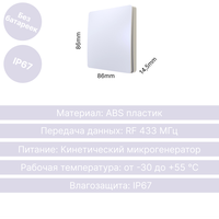 | Дополнительная информация | реле приобретается отдельно; питание от кинетического микрогенератора; ресурс работы: от 200,000 нажатий; дальность работы: 150 м (улица), 50 м (помещение); вес 110 гр |