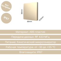 | Дополнительная информация | реле приобретается отдельно; питание от кинетического микрогенератора; ресурс работы: от 200,000 нажатий; дальность работы: 150 м (улица), 50 м (помещение); вес 110 гр |