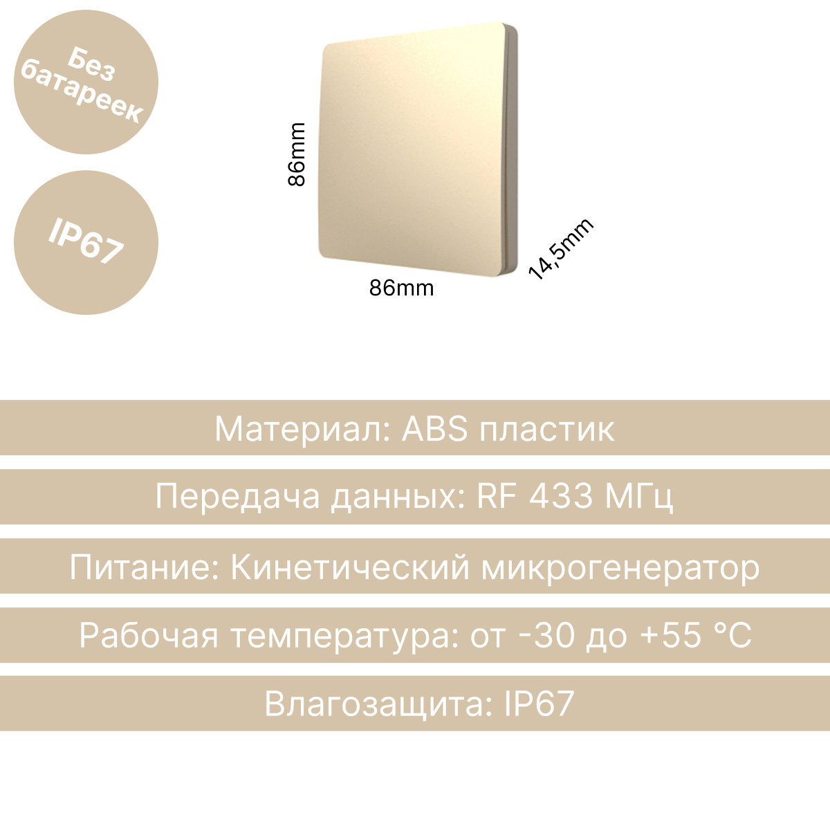 Размеры выключателя (Д x Ш x Т): 86 x 86 x 14,5 мм.