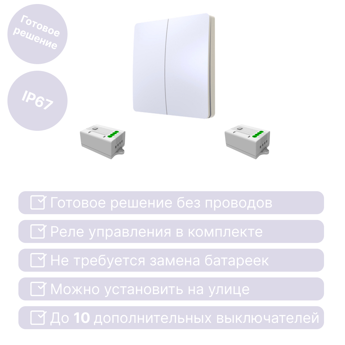 Беспроводной выключатель GRITT Space 2кл. белый комплект: 1 выкл. IP67, 2 реле 1000Вт 433 МГц - беспроводной кинетический (без батареек) выключатель для удаленного включения электроприборов без прокладки электропроводки к выключателю. Работает с реле GRITT Core (в комплекте) и EnCore (приобретается отдельно).