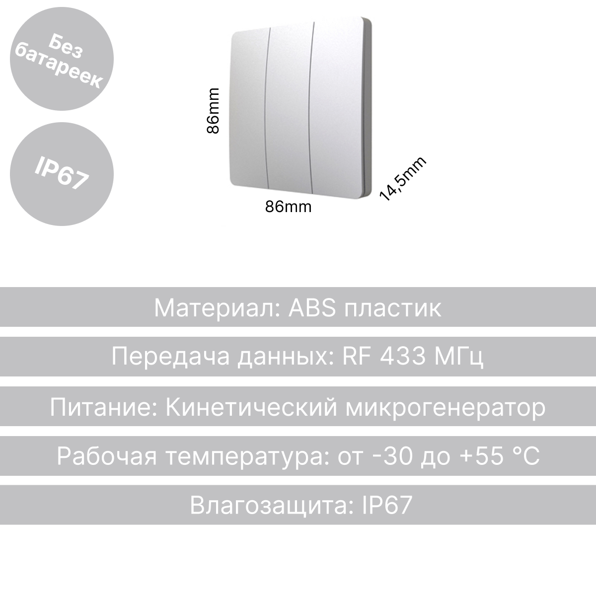 | Дополнительная информация | реле приобретается отдельно; питание от кинетического микрогенератора; ресурс работы: от 200,000 нажатий; дальность работы: 150 м (улица), 50 м (помещение); вес 110 гр |