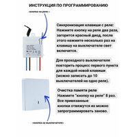 Нажмите кнопку на реле два раза, загорится диод, после этого нажмите на клавишу на выключателе, светодиод мигнёт это будет означать что, после нажатия выбранной кнопки один раз, реле включится и выключится только после однократного нажатия той-же кнопки.