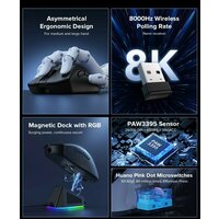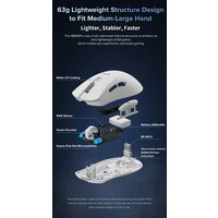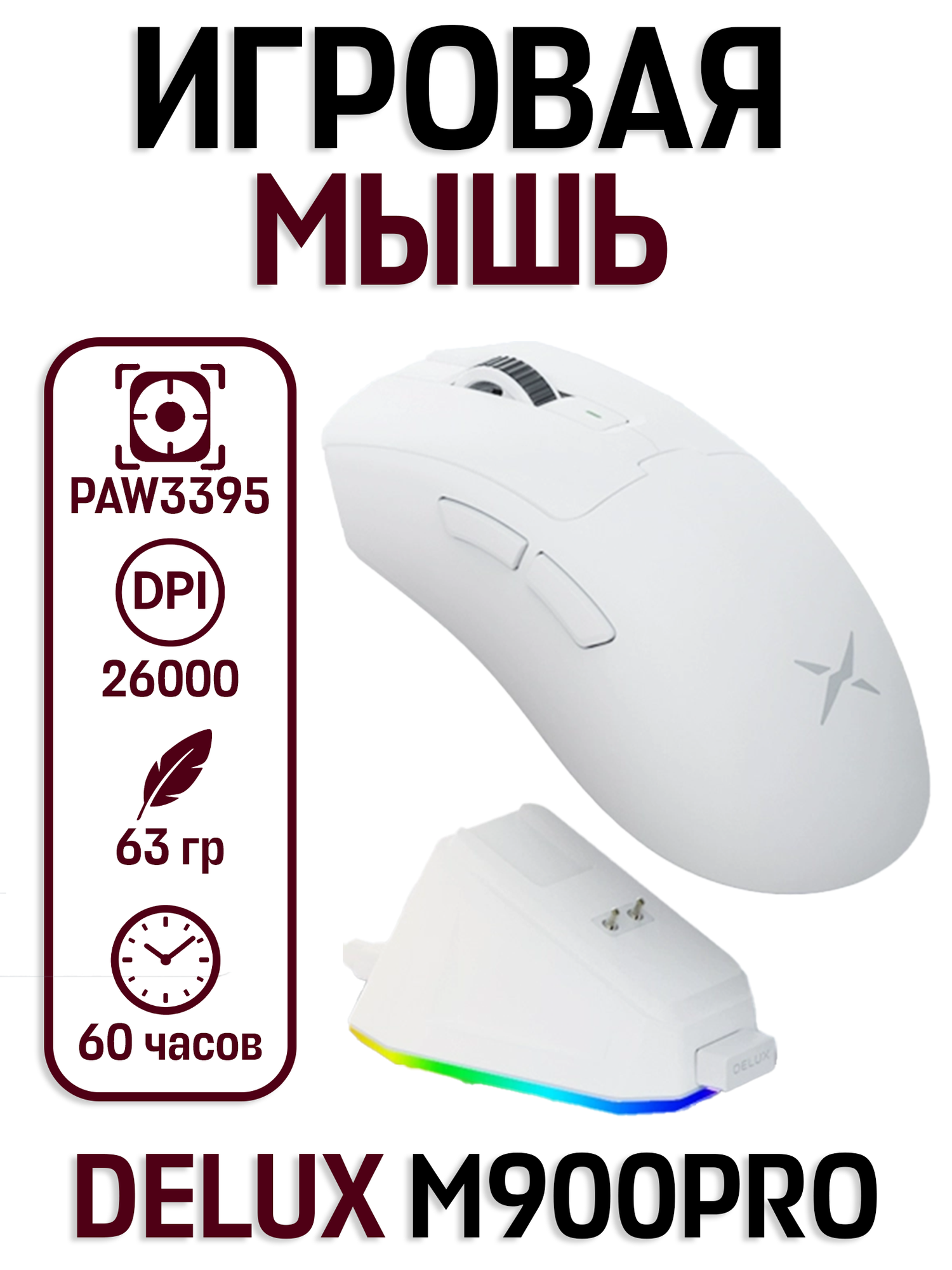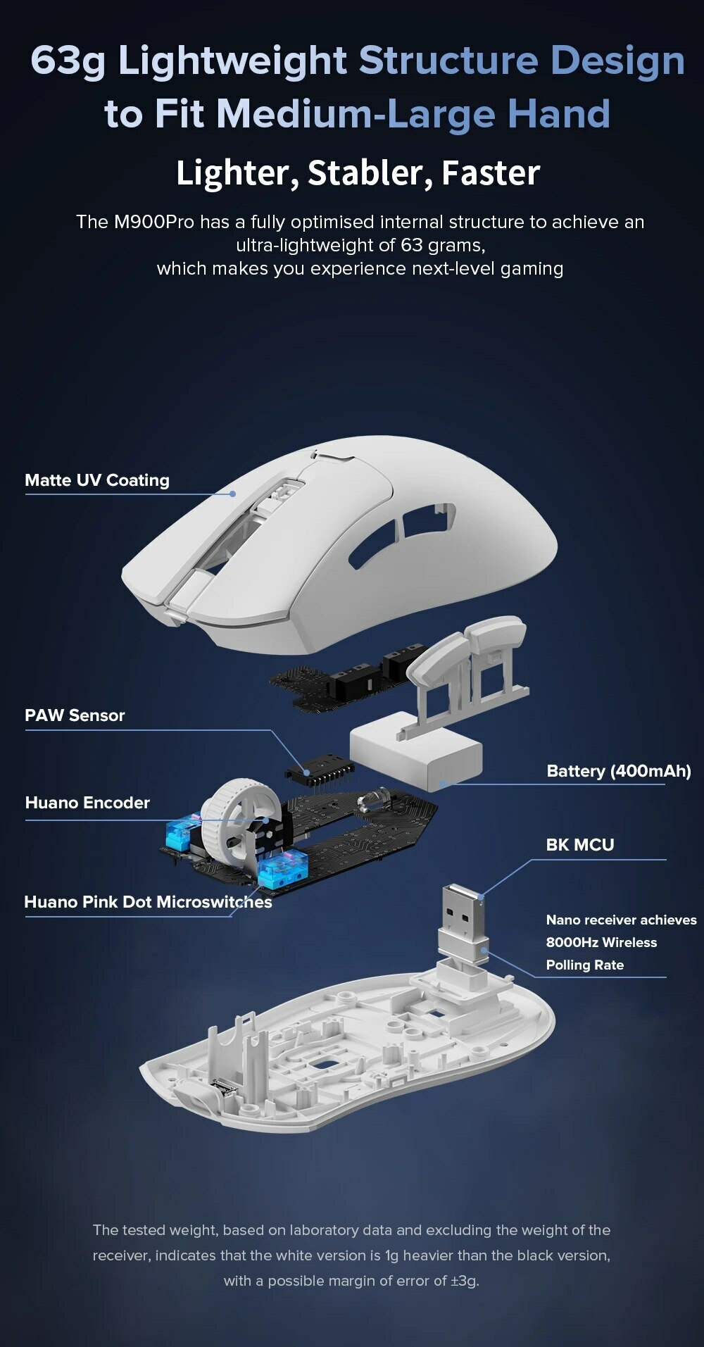 | Комплектация | 1 x Мышь M900PRO PAW3395 1 x 2.4gHz USB Приемник 1 x тефлоновые ножки 1 x Противоскользящий Глайды 1 x Магнитная зарядная станция 1 x паракордовый кабель длиной 1,6 м 1 x Руководство пользователя |