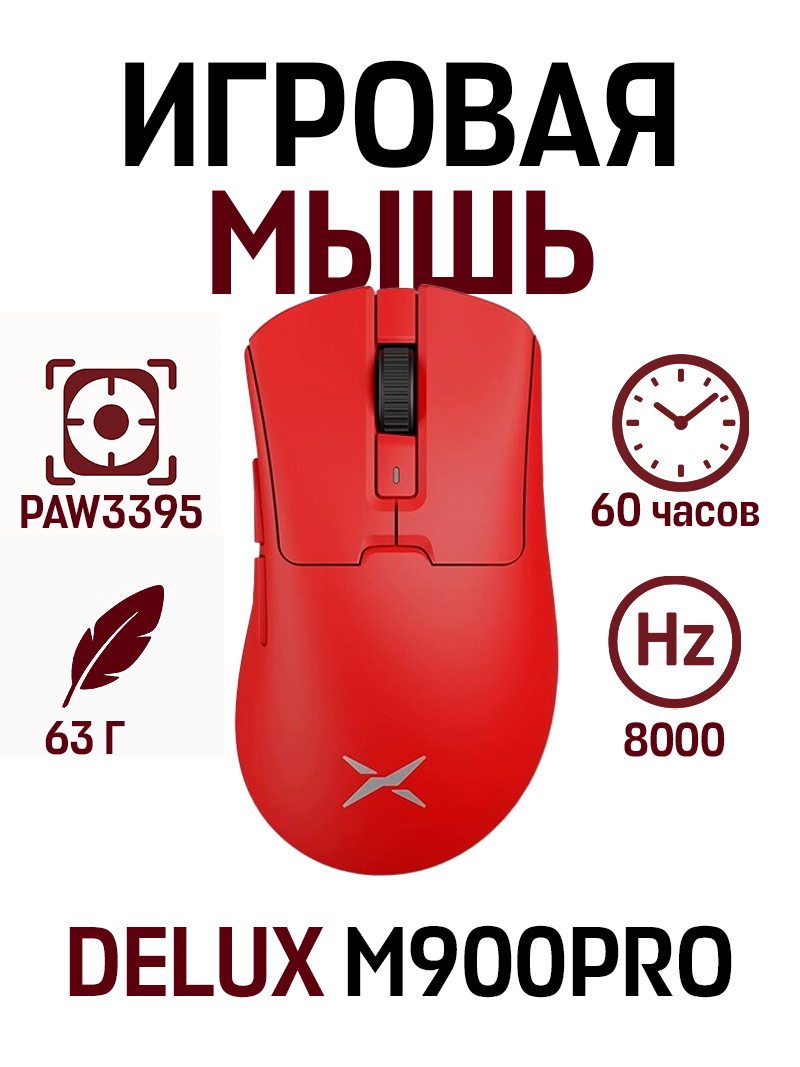 Беспроводня игровая мышь DELUX M900PRO PAW3395, 26000 DPI, 60 ч, 63 гр, 8000 Hz, красная: сравнение цен, характеристики, фото, актуальное наличие и цены.