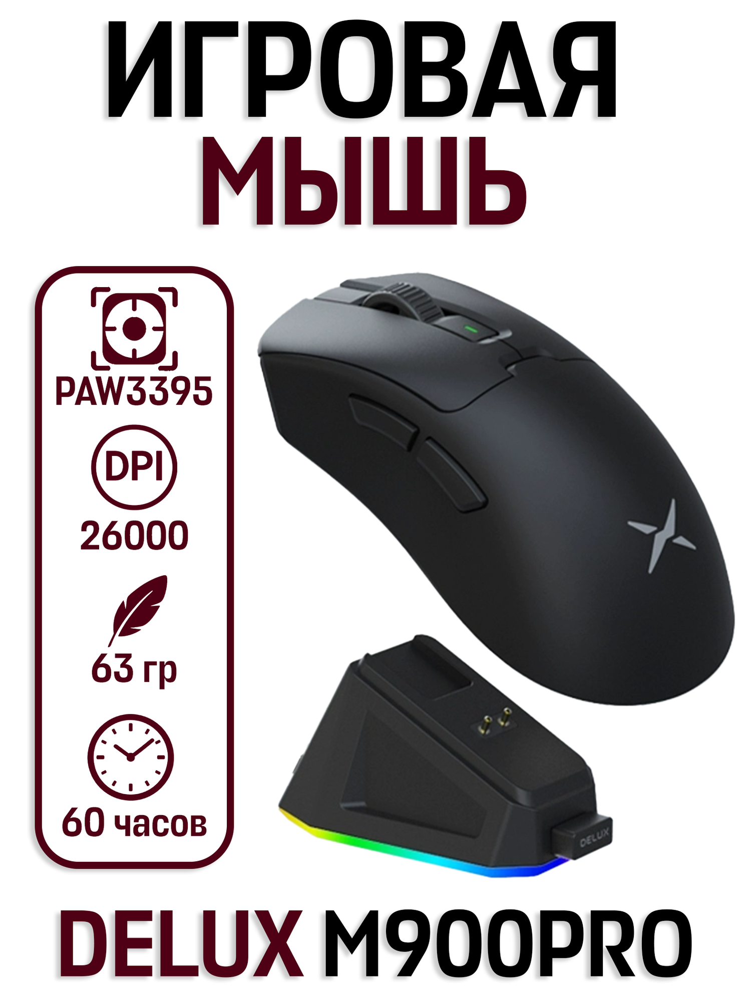 | Комплектация | 1 x Мышь M900PRO PAW3395 1 x 2.4gHz USB Приемник 1 x тефлоновые ножки 1 x Противоскользящий Глайды 1 x Магнитная зарядная станция 1 x паракордовый кабель длиной 1,6 м 1 x Руководство пользователя |