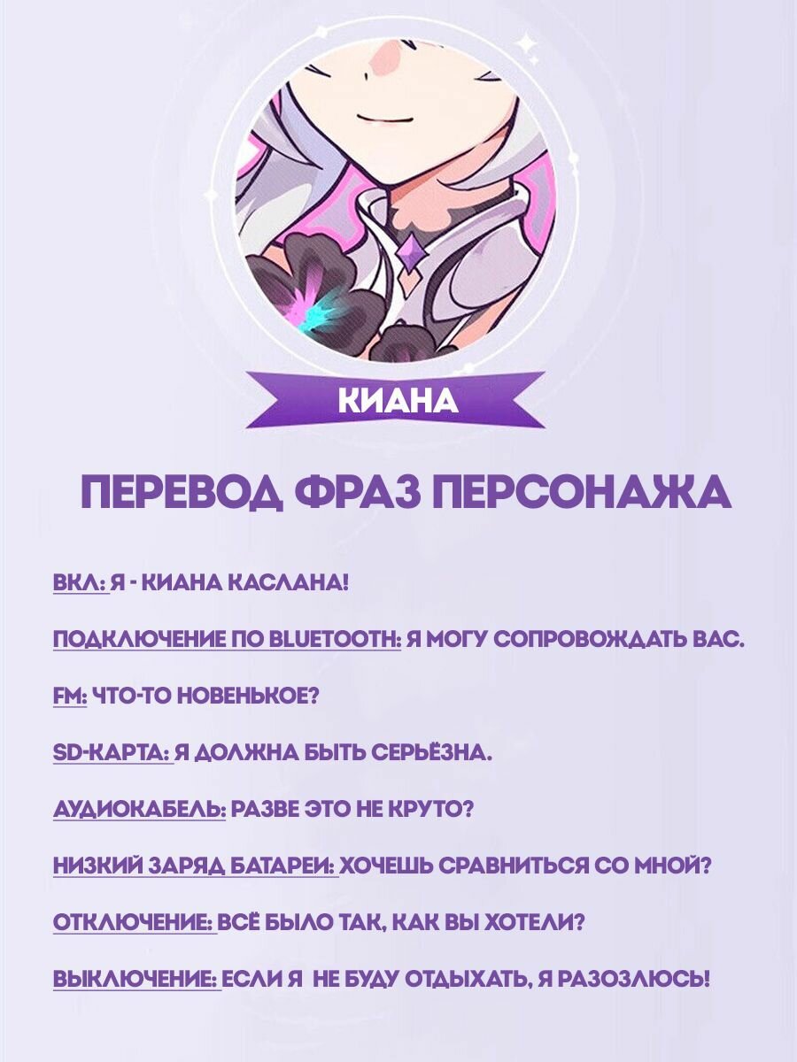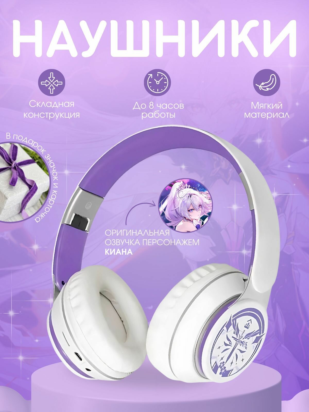 | Комплектация | Наушники; Значок с персонажем; Карточка (может попасться не из набора, со случайным персонажем); Аудиокабель Jack 3.5; Зарядный кабель Micro-USB; Коробка. |