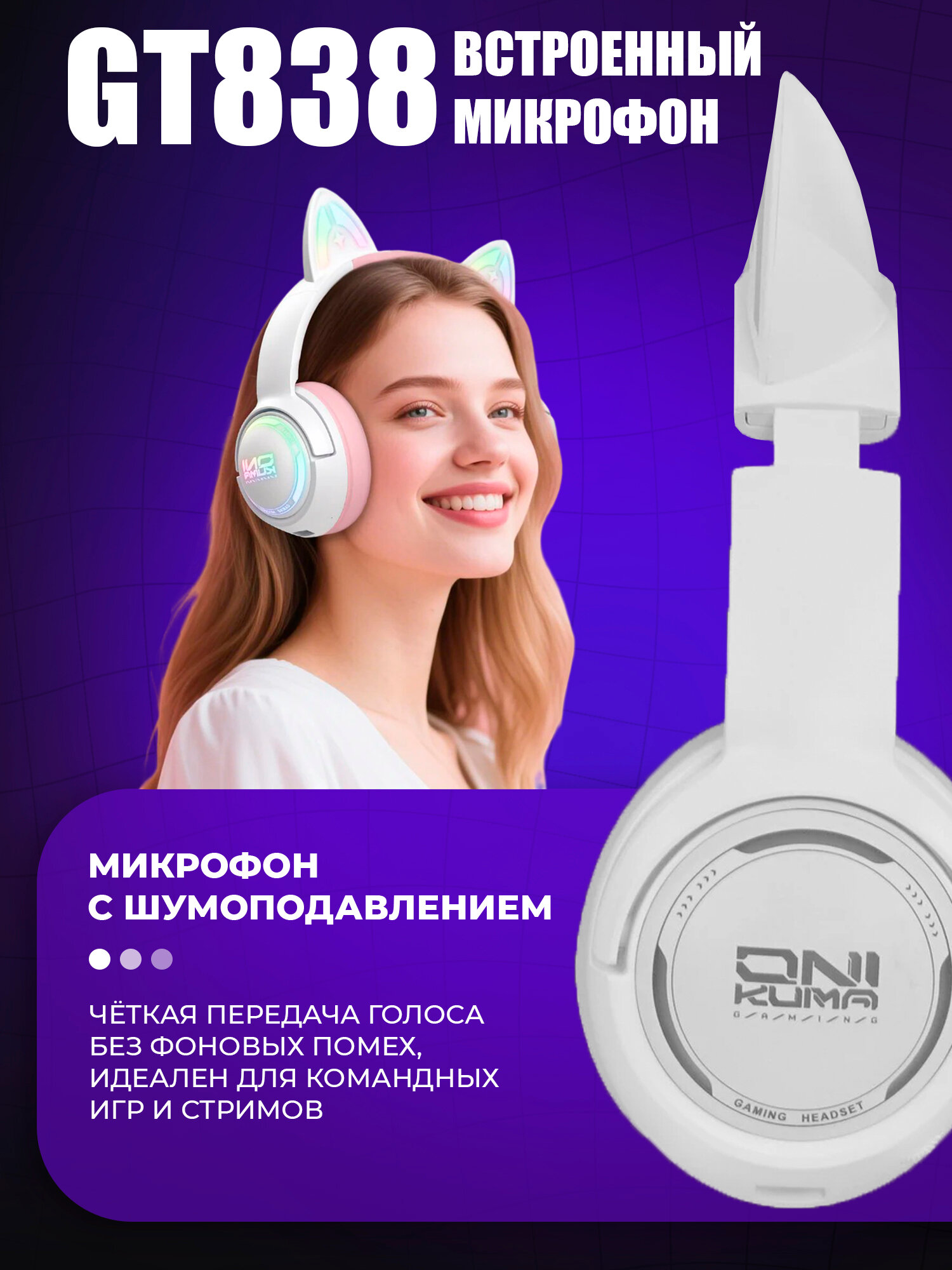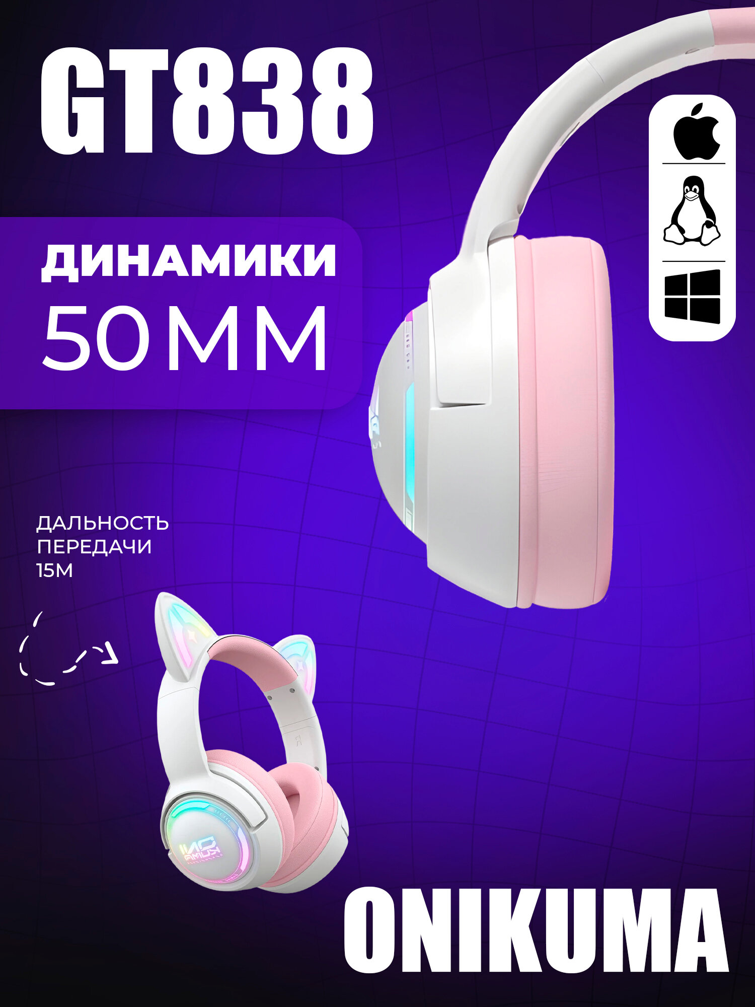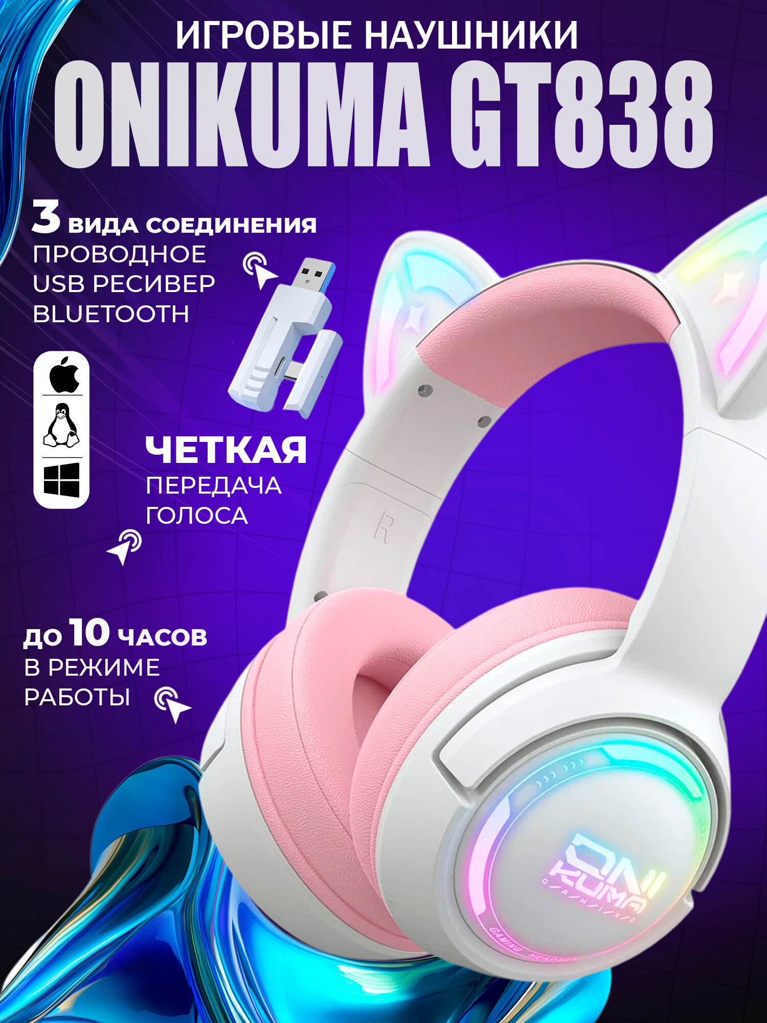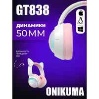 Беспроводные игровые наушники с микрофоном и ушками ONIKUMA GT838 (2.4G/BT/AUX), бело-розовые: сравнение цен, характеристики, фото, актуальное наличие и цены.