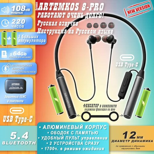 Беспроводные наушники с микрофоном, спортивные, нашейные ARTEMKOS (Артемкос) 8-PRO BLACK BT 5.4, 220 часов, 9D Sound Bass, превосходное качество звука