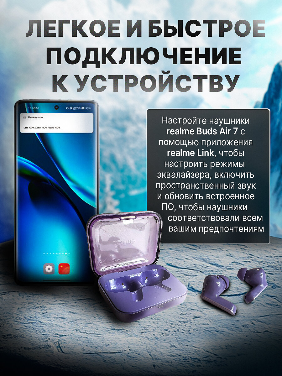 Откройте для себя мир качественного звука с беспроводными наушниками Realme Buds Air 7! Эти стильные и удобные наушники идеально подходят для музыки, игр и общения. Ключевые особенности: Активное шумоподавление: Забудьте о посторонних звуках и погрузитесь в любимую музыку благодаря передовой технологии активного шумоподавления. Bluetooth 5.4: Быстрое и стабильное соединение с вашим устройством на расстоянии до 10 метров. Подключайте наушники к смартфону, планшету или ноутбуку без лишних усилий. Долгое время работы: Наслаждайтесь до 52 часов воспроизведения с зарядным чехлом. Наушники работают до 7.5 часов на одном заряде с активным шумоподавлением. Качественный звук: 12.4 мм драйверы обеспечивают глубокий бас и чистые высокие частоты, что делает каждую ноту звучащей идеально. Удобство и стиль: Легкий и эргономичный дизайн наушников обеспечивает комфорт даже при длительном использовании. Доступны в нескольких цветах, чтобы подчеркнуть ваш стиль. Преимущества Realme Buds Air 7:6 микрофонов для кристально чистой передачи голосаНизкая задержка звука всего 45 мс для геймеровВодоотталкивающая защита для активного образа жизниПочему стоит выбрать Realme Buds Air 7? Эти беспроводные наушники идеально подходят для активных пользователей, которые ценят качество звука и удобство. Будь то занятия спортом, работа в шумном офисе или просто отдых с любимой музыкой — Realme Buds Air 7 станут вашим надежным спутником.