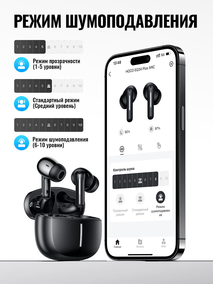Беспроводные наушники HOCO EQ34 Plus: комфорт и качество звука Комфорт и качество звука Беспроводные наушники HOCO EQ34 Plus обеспечивают комфортное прослушивание музыки и разговоров благодаря технологиям активного шумоподавления (ANC) и активного шумоподавления (ENC). Управление через мобильное приложение позволяет настроить работу наушников под ваши предпочтения. Премиальное звучание Наушники оснащены динамическими драйверами с максимальной воспроизводимой частотой 20000 Гц и минимальной воспроизводимой частотой 20 Гц. Диаметр мембраны составляет 13 мм, что обеспечивает качественное звучание. Комплектация и характеристики В комплект HOCO EQ34 Plus входят: фирменная упаковка, кейс с наушниками, инструкция на русском языке, кабель Type-C для зарядки, сменные амбушюры. Наушники работают на литий-ионных аккумуляторах, а кейс для зарядки поддерживает USB Type-C. Вес одного наушника составляет 4,48 г, а вес всего комплекта – 44,8 г. Цвет и конструкция Наушники имеют стильный черный цвет и внутриканальную конструкцию. Беспроводные наушники HOCO EQ34 Plus оснащены Bluetooth 5.4 и сенсорным дисплеем, что делает их удобными в использовании. Выбирая беспроводные наушники HOCO EQ34 Plus, вы получаете современное решение с расширенным функционалом и качественным звучанием для повседневного использования.