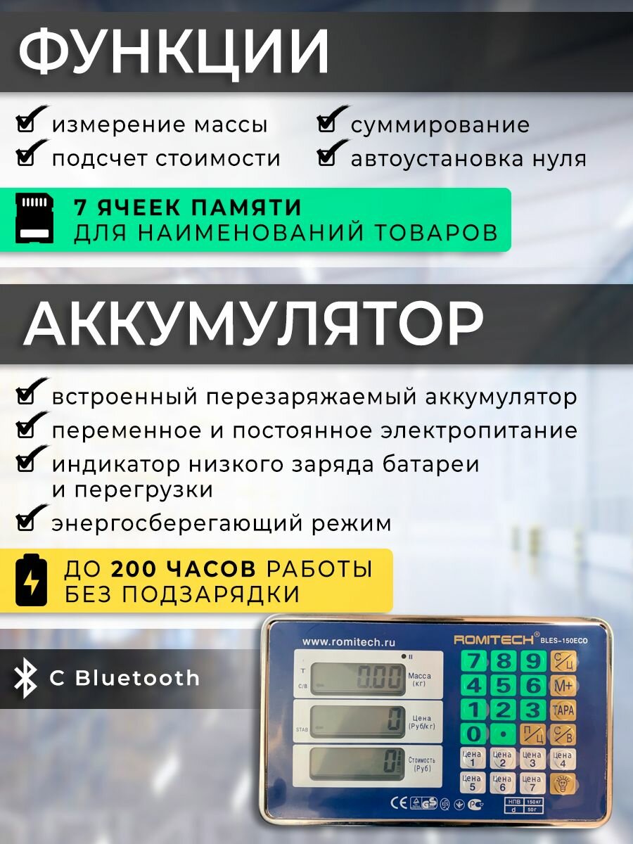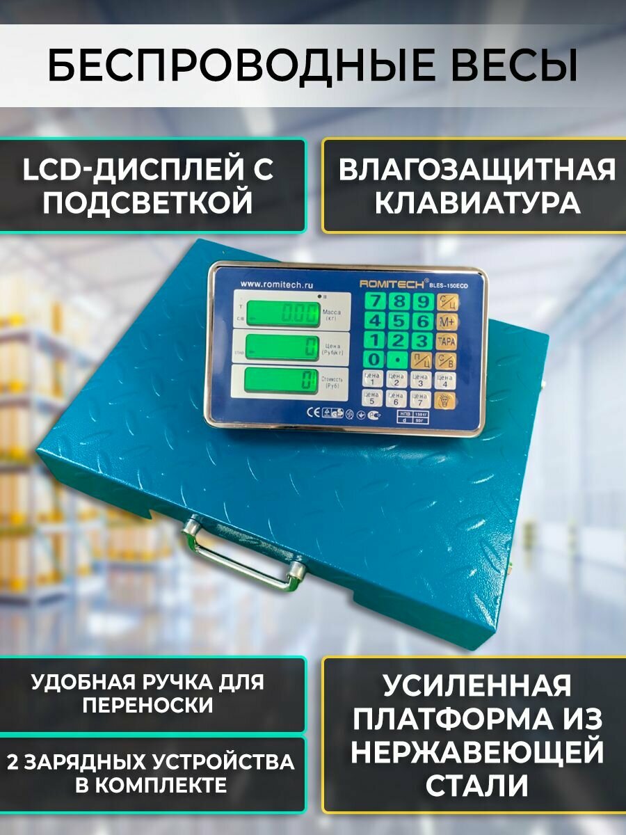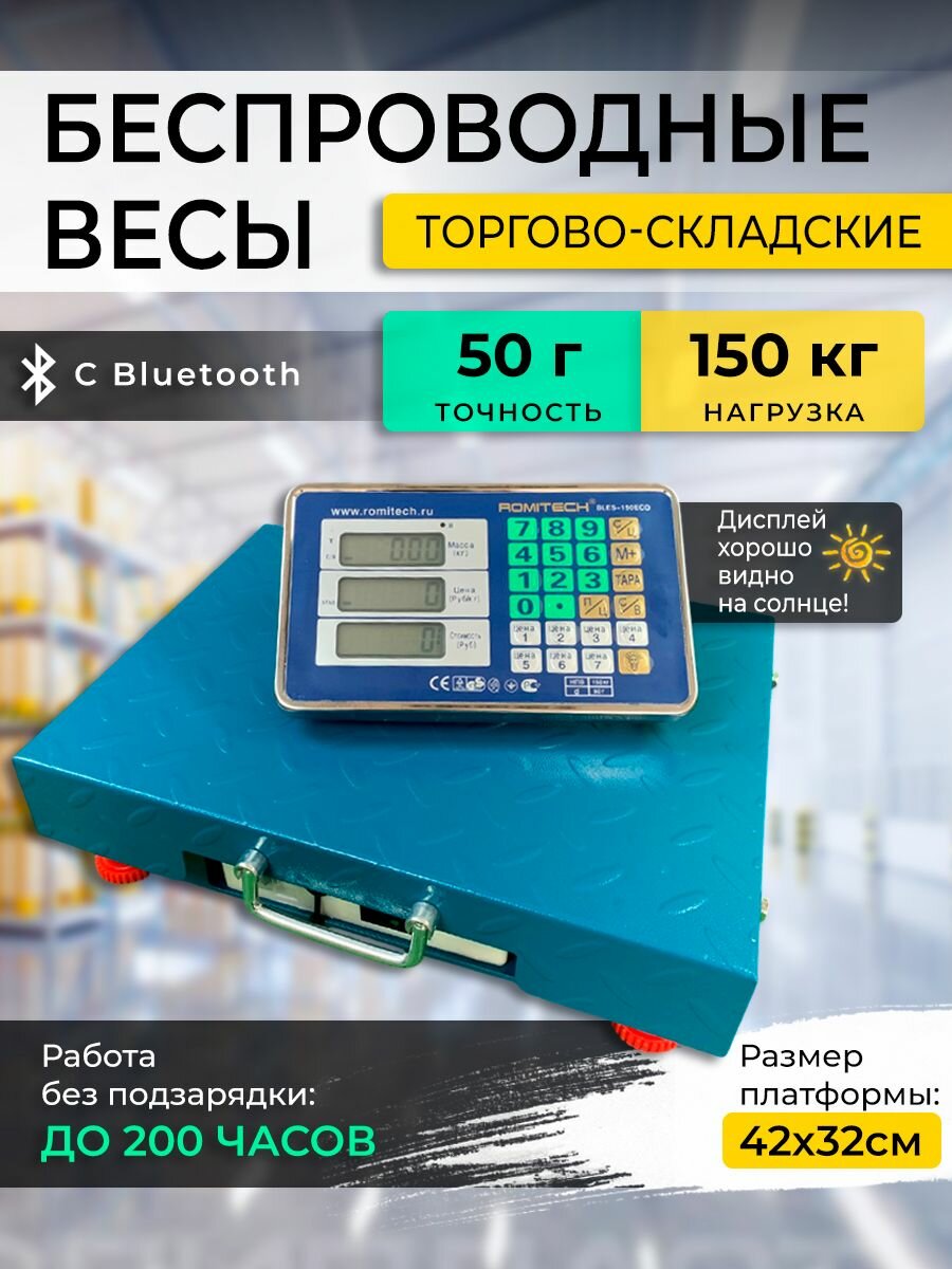 Беспроводные весы напольные торговые 42×32см до 150 кг +чехол, Romitech BLES-150ECO, платформа, LCD, АКБ до 200 часов, счетные товарные платформенные электронные: сравнение цен, характеристики, фото, актуальное наличие и цены.