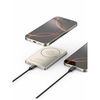 Корпус сделан из сверхлегкого алюминиевого сплава. Поддержка беспроводной зарядки Qi c функцией магнитного совмещения MagSafe. Встроенные магниты фиксируют зарядное устройство на задней панели iPhone 12 - 16 серий, гарантируя их идеально точное совмещение, поэтому зарядка выполняется быстрее. Поддерживает зарядку по стандарту Qi, что позволяет заряжать модели iPhone 8 и новее при наличие чехла MagSafe. Встроенная защита от перегрева, перезаряда и глубокого разряда элементов питания, короткого замыкания, превышения допустимого напряжения и силы тока подключенных устройств. Заряд аккумулятора производится через разъем USB-C (кабель входит в комплект). Зарядка начинается автоматически: аккумулятор не нужно включать и выключать. При этом он никак не воздействует на кредитные карты или магнитные ключи. Имеется точечный индикатор уровня заряда аккумулятора и кнопка включения / выключения. В комплект входит зарядный кабель USB-C - USB-C поддержкой быстрой зарядки PD 65 Вт черного цвета. Длина кабеля 20 см. Аккумулятор можно использовать для зарядки любых цифровых устройств обычным проводным методом через разъем USB-C. Имеется поддержка быстрой зарядки Power Delivery 20 Вт. Поддерживается сквозная зарядка - одновременно можно заряжать повербанк через провод и iPhone беспроводным методом.