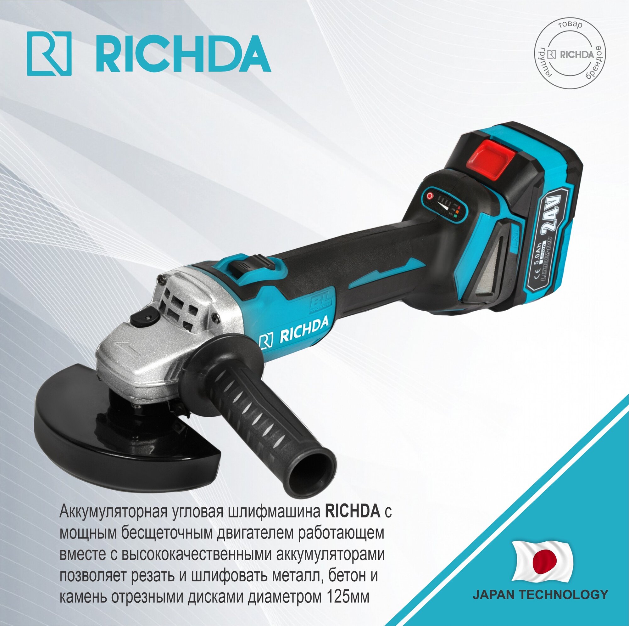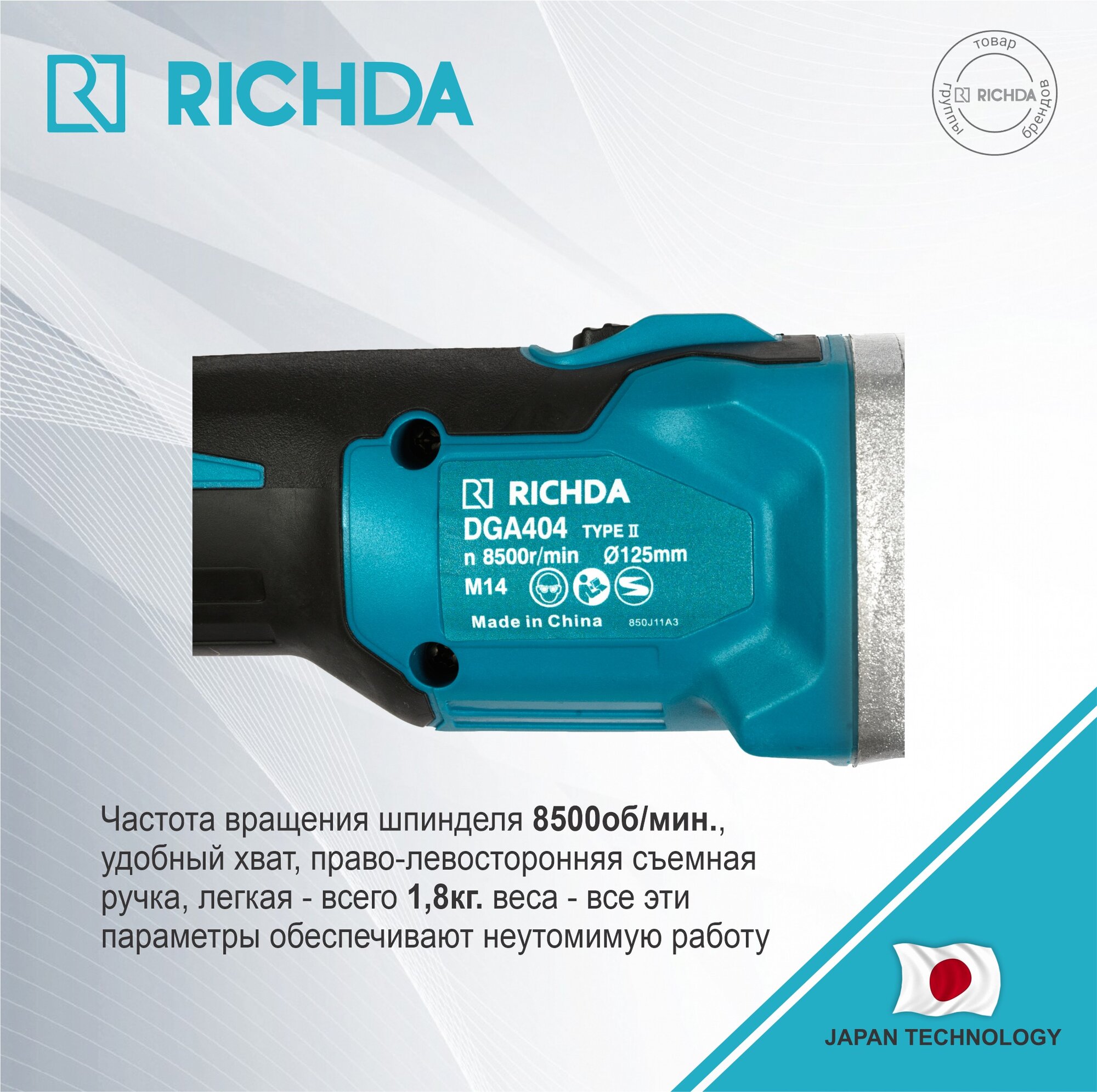 Купить Бесщеточная угловая шлифмашинка болгарка RICHDA DGA404 Аккумуляторная в оригинальном кейсе 2АКБ 24v 5.0Ah с доставкой по всей России.