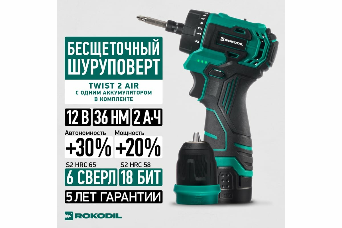 Купить Бесщеточный аккумуляторный шуруповерт Rokodil Twist 2 Air 12 в, 36 нм, 2 ач, 1400 об/мин 1 АКБ 1047196 с доставкой по всей России.